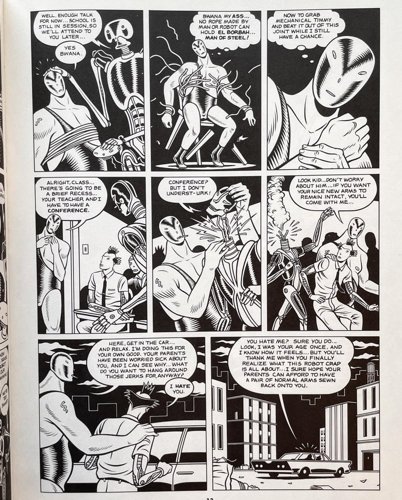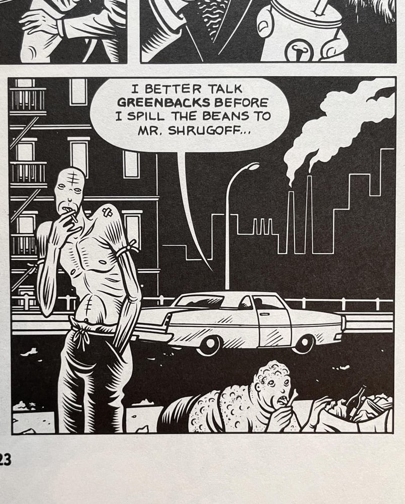 I used to think this era of Burns was so different from the later work, but as I reacquaint myself with this one I see a lot more of the mutation-and-erosion stuff. The container stories and overall design are lower stakes, sort of quotational and poppy, but the drawings are still supercharged goth-sublime.
